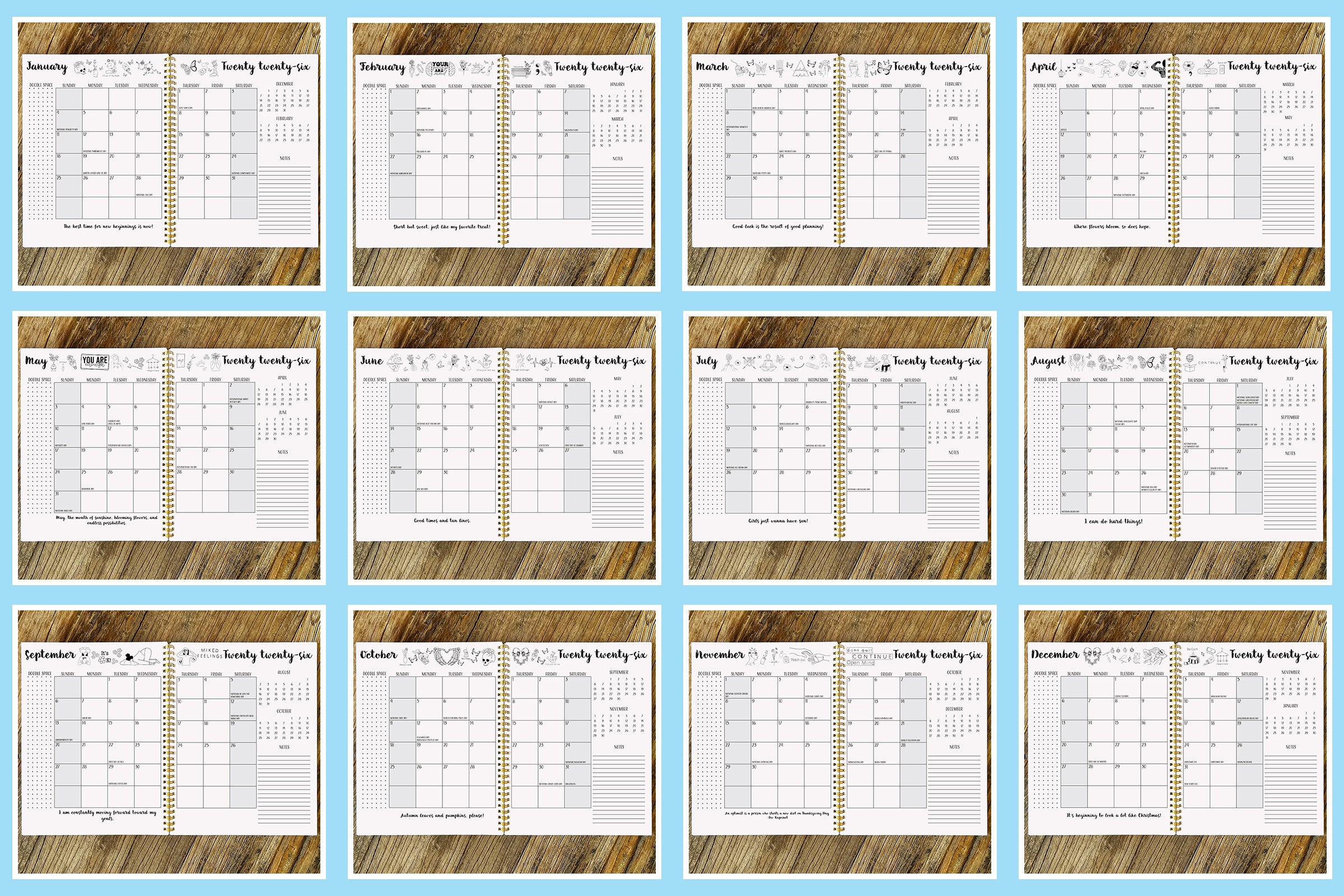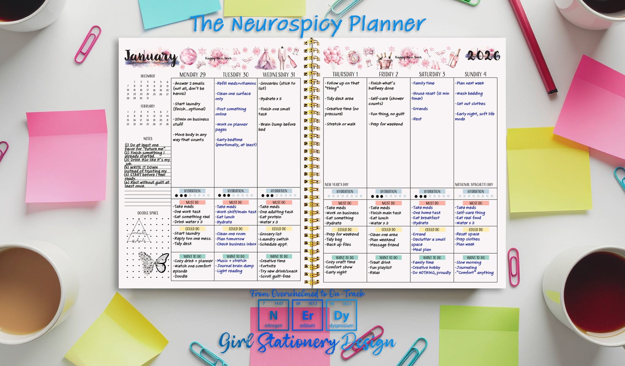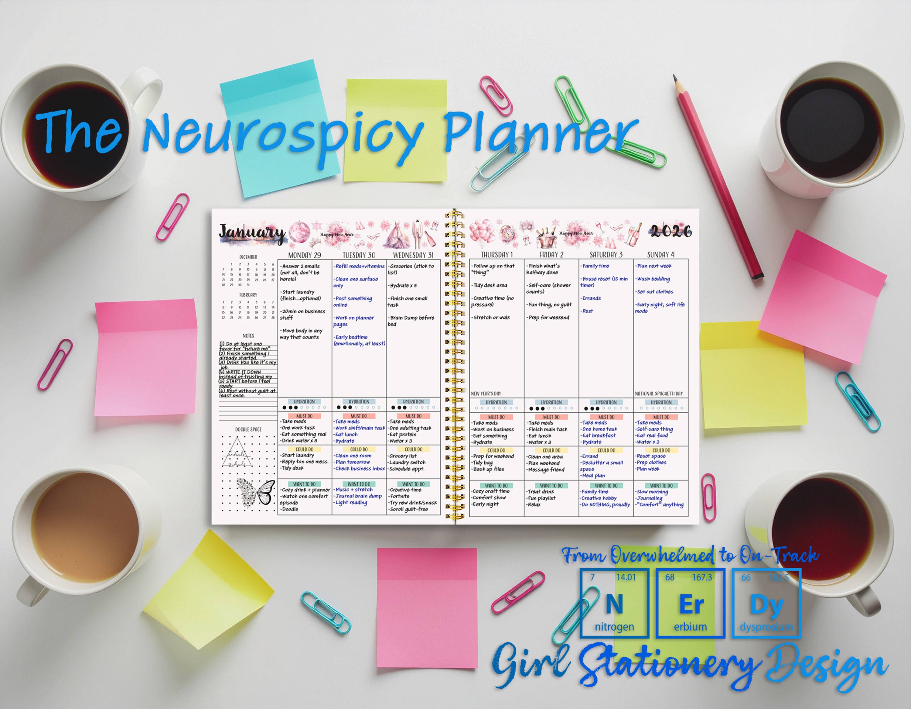 The Neurospicy Hardcover Planner is available in both COLOR and BLACK & WHITE. Each planner offers two cover style options—Limon Script or Bold Print. These font variations apply only to the “2026” text on the cover. Please refer to the slideshow below for a preview of the Monthly Calendars and Monthly Focus Pages.