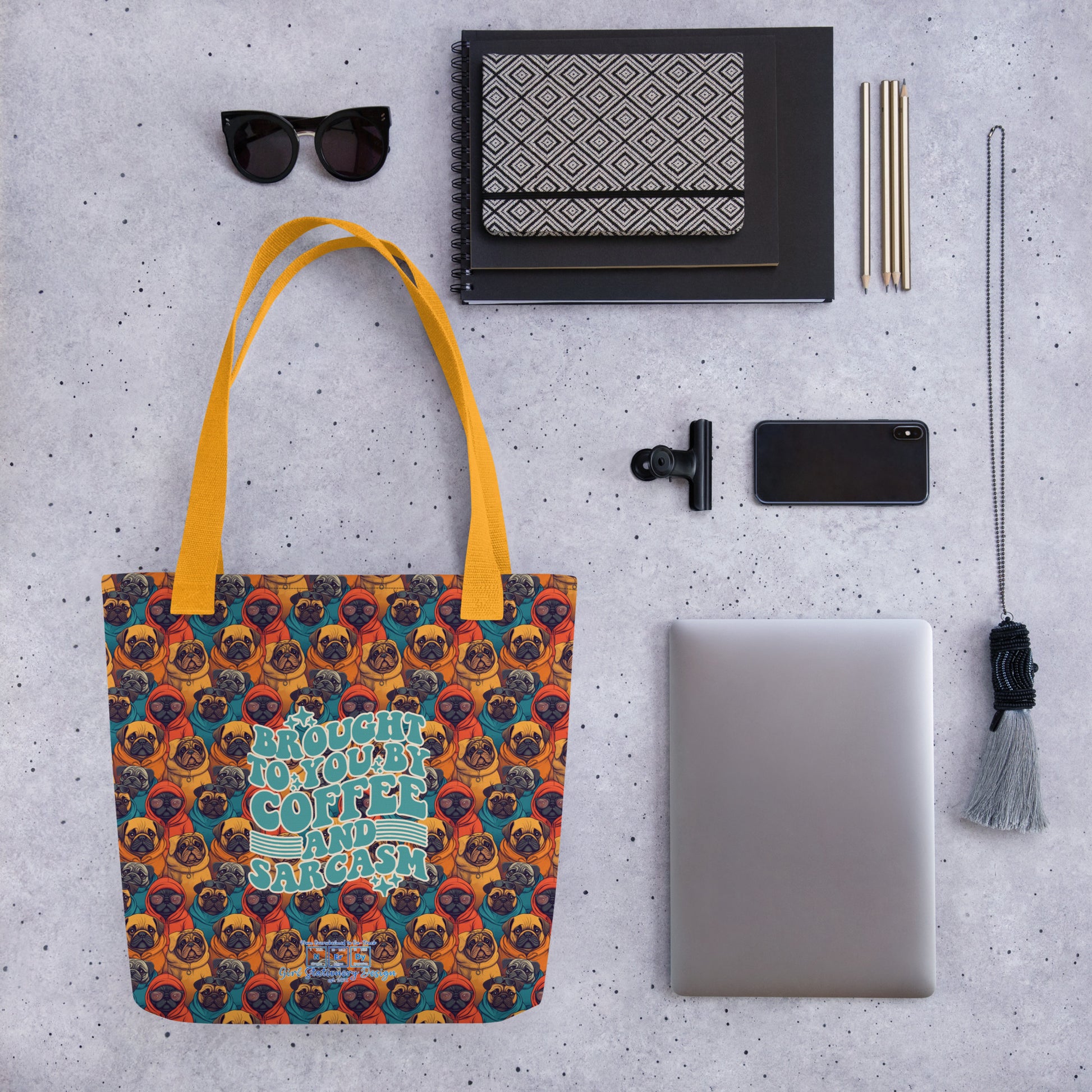 Sassy Pugs Tote Bag – Fueled by Coffee & Sarcasm Reusable Shopper with Yellow Straps